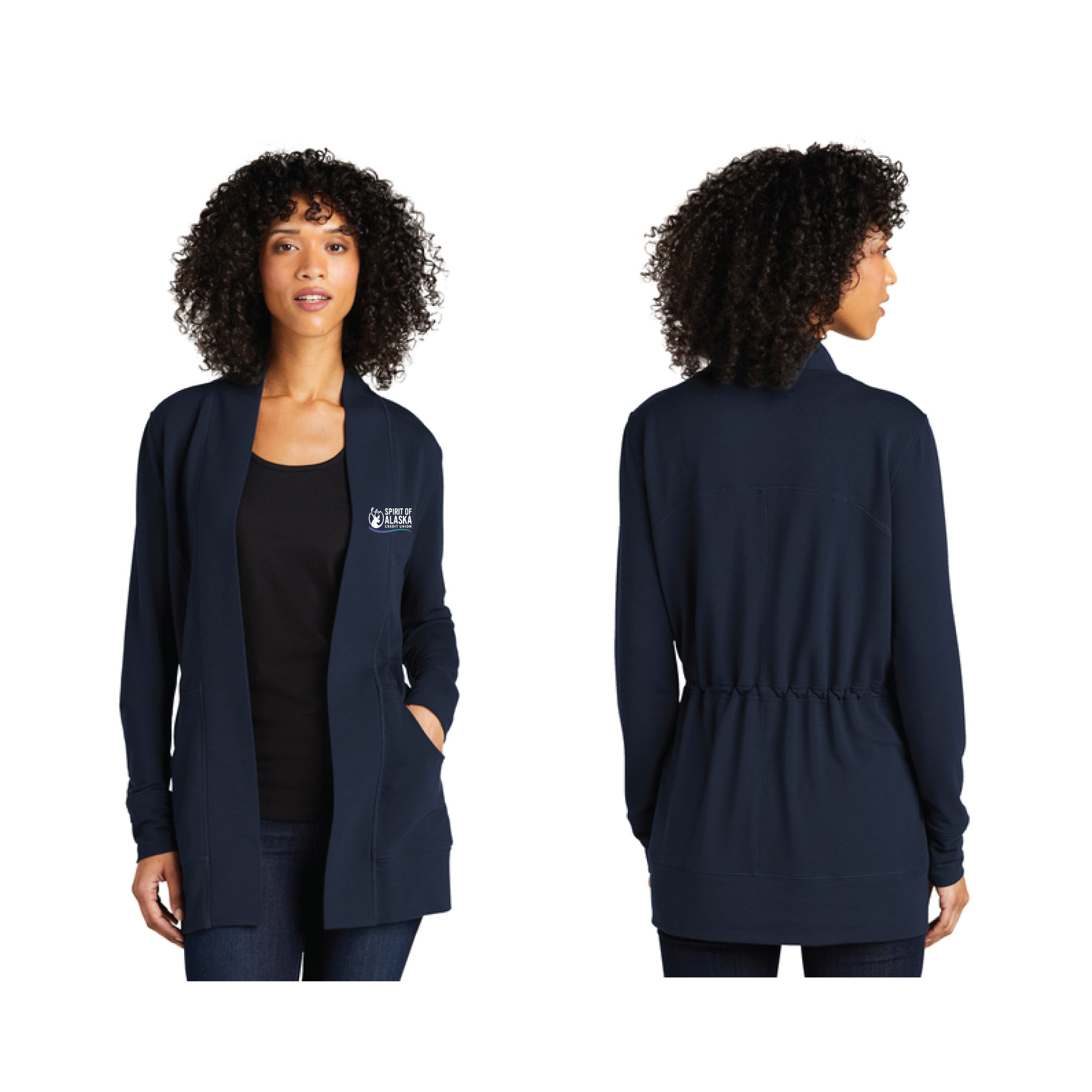 A layering must-have made of ultra-soft, snag-resistant microterry—it’s as comfortable as it is polished in appearance. 6.8-ounce, 62/33/5 poly/rayon/spandex microterry. Snag-resistant. Open front cardigan. Interior drawcord with toggles at waist. Front pockets. Curved back yoke. Front and back seaming details. Self-pieced cuffs and hem.